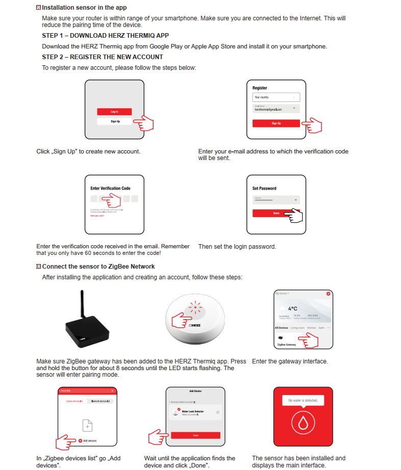 HERZ Thermiq Senzor za zaznavanje vodnih puščanj hitro zazna vodo z visoko občutljivimi elektrodami in je enostavno ga postaviti na tla. Komunicira prek ZigBee 3.0 in pošilja takojšnja obvestila o alarmu v aplikacijo HERZ Thermiq. Omogoča pametno avtomatizacijo, kot je zaprtje ventila, in ga poganja dolgotrajna baterija CR2032.
