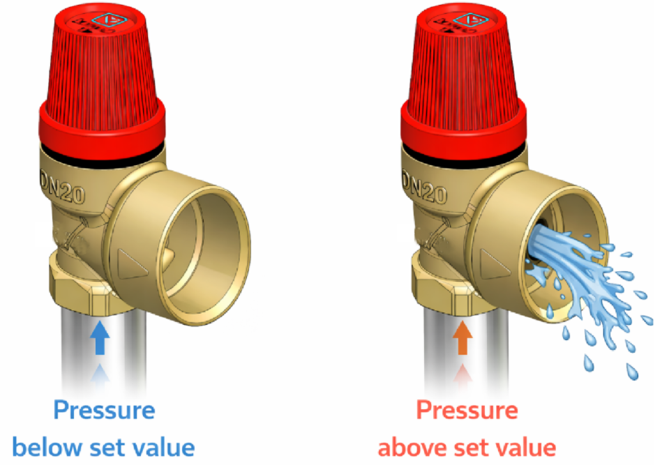 Ko tlak preseže dovoljeno vrednost se ventil odpre. Medij se odvaja skozi iztok, dokler se tlak ne zniža na varno raven, nato pa se ventil samodejno ponovno zapre.