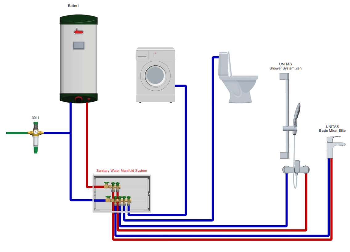 Vsak izhod sanitarnih zbiralnikov (npr. umivalnik, kopel, itd.) je označen z majhno nalepko, ki je bodisi modra bodisi rdeča, in vsebuje ikono, ki označuje mesto uporabe (*nalepke so priložene izdelku). RDEČE nalepke so namenjene vročim krogom, MODRE nalepke pa hladnim krogom.