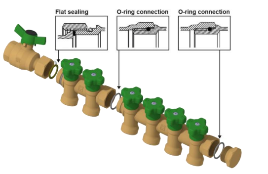 Tesnenje:Vsi HERZ sanitarni razdelilniki omogočajo hitro in enostavno razširitev z dodatnimi enotami (DN20: 2/3/4 veje ali DN25: 4/5 vej). Vnaprej vgrajena O-tesnila na ohišju zagotavljajo zanesljivo povezovanje več razdelilnikov brez potrebe po dodatnih tesnilih ali lepilih.